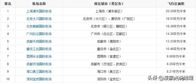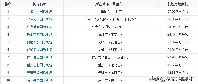 截至2021年6月25日,中国245座颁证民用运输机场中,机场用地面积排名前十的机场名单(数据)如下表所示: