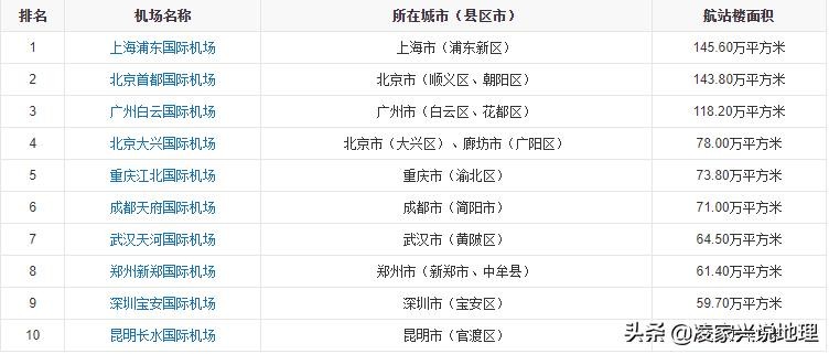 截至2021年6月25日,中国245座颁证民用运输机场中,航站楼面积排名前十的机场名单(数据)如下表所示: