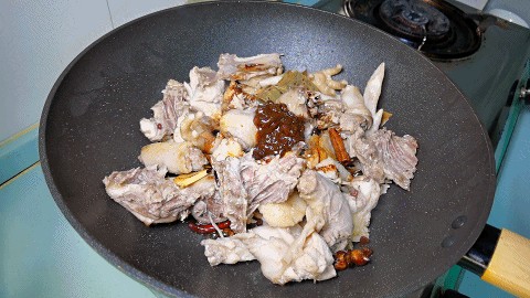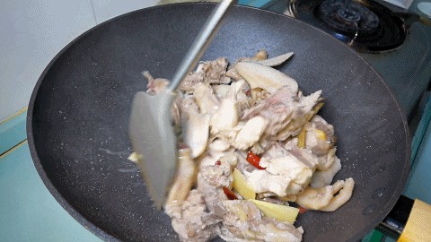 6.下入焯水后的鸡块,沿着锅边淋入一圈料酒去腥,多煸炒一会,炒出鸡块中的水气。