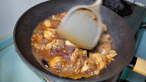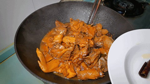 9.炖30分钟后鸡块已经软烂入味,接着把锅内的各种辅料挑出,转大火收浓汤汁。