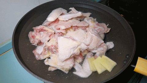 4.锅中加入清水,把鸡块凉水下锅,加入姜片,淋入料酒更好去腥,大火烧开后焯水5分钟,然后捞出沥干水分。