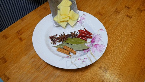 2.准备一些辅料,有姜片、花椒、八角、桂皮、香叶、红辣椒,把这些辅料放一起备用。