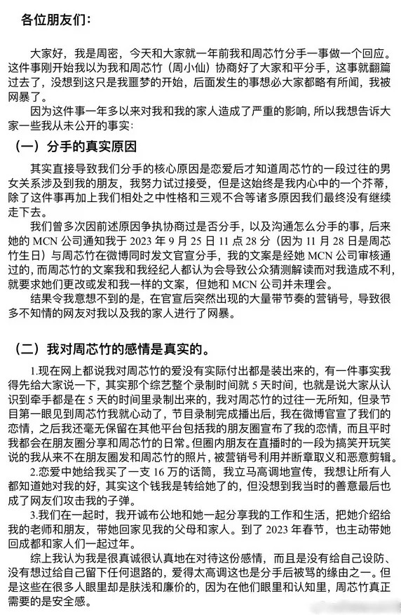 分手一年多后,11月29日,周密突然发长文再谈和周芯竹分手事情,称两人协商和平分手是“噩梦的开始”,还表示分手的主要原因是因为周芯竹与他认识的人曾经交往过。