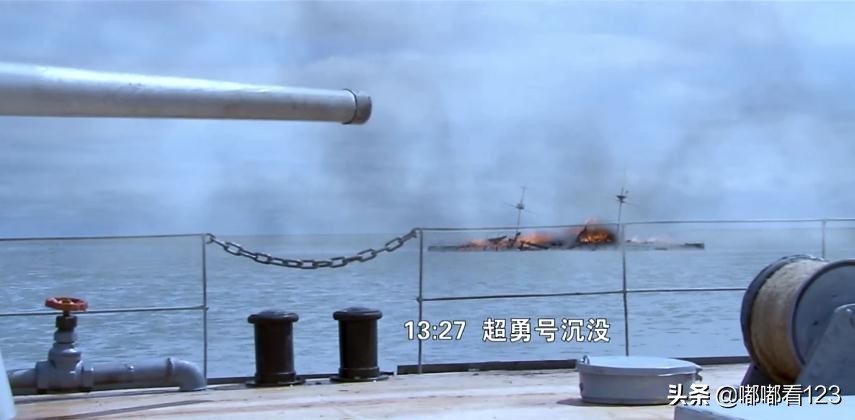 1时27分,自开战伊始就被大火包围的“超勇”舰,终因火势无法控制而沉没,成为此次海战中北洋水师损失的第一艘军舰。军舰下沉之时,从登陆场赶来的鱼雷艇“左一”急忙靠近抛下绳索救援落水士兵,管带黄建勋拒绝援救,随同战舰一同沉没,壮烈殉国。