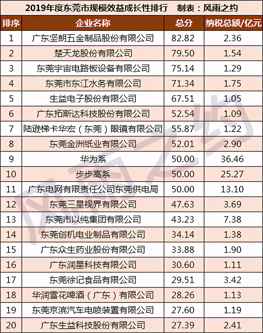 广东坚朗五金制品股份有限公司、楚天龙股份有限公司、东莞宇宙电路板设备有限公司、东莞市东江水务有限公司排名前四,值得注意的是,华为系纳税额高达36.46亿元,步步高系纳税额高达25.27亿元,广东电网有限责任公司东莞供电局纳税额高达13.1亿元,是东莞市纳税最多的三家企业。