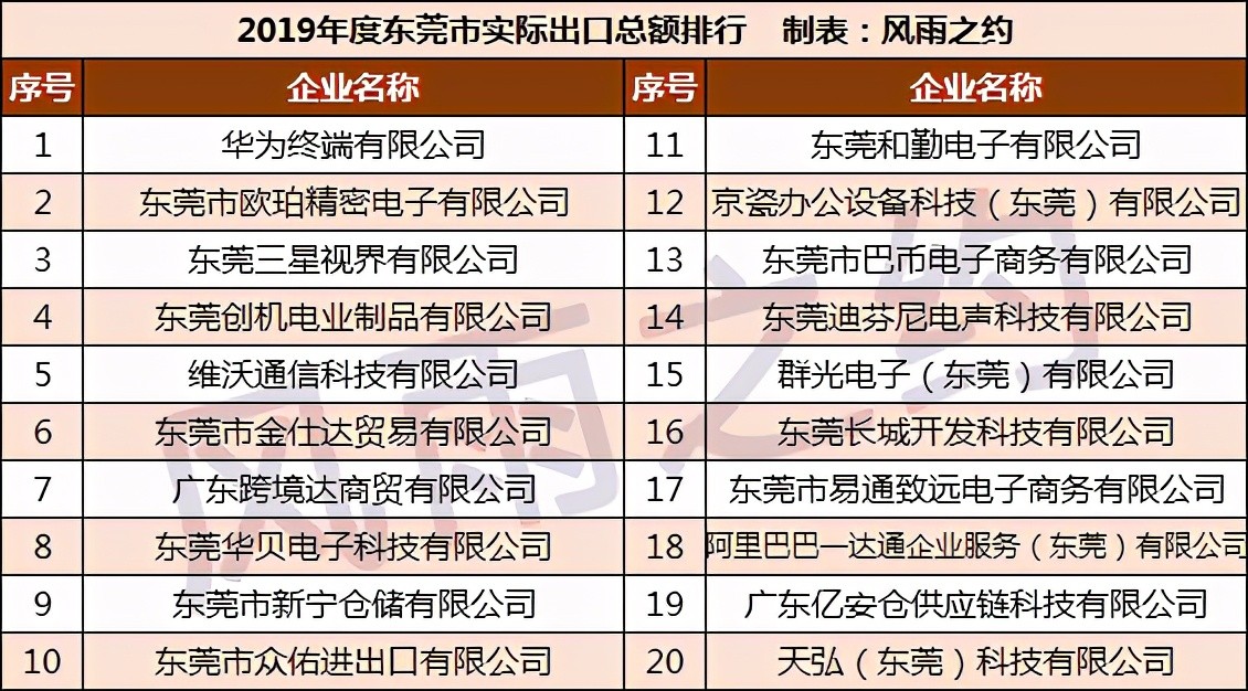 华为终端有限公司、东莞市欧珀精密电子有限公司、东莞三星视界有限公司、东莞创机电业制品有限公司、维沃通信科技有限公司、东莞市金仕达贸易有限公司、广东跨境达商贸有限公司、东莞华贝电子科技有限公司、东莞市新宁仓储有限公司、东莞市众佑进出口有限公司是东莞市出口规模最大的十家企业.。