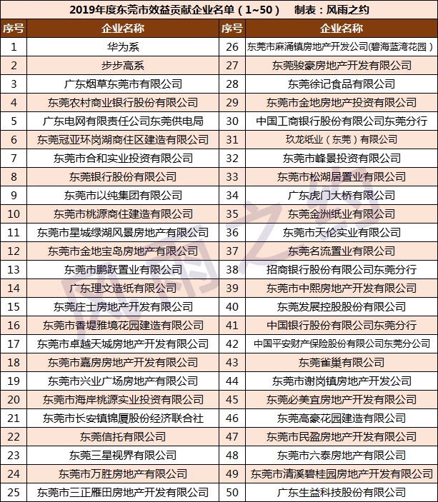 华为系、步步高系、广东烟草东莞市有限公司、东莞农村商业银行股份有限公司、广东电网有限责任公司东莞供电局、东莞冠亚环岗湖商住区建造有限公司、东莞市合和实业投资有限公司、东莞银行股份有限公司、东莞市以纯集团有限公司、东莞市桃源商住建造有限公司是东莞市效益贡献最大的十家企业。