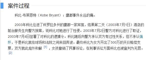 在2003年科比曾入住科罗拉多州的一家宾馆,在入住第二天便被警察逮捕称他涉嫌性侵案,对方是年仅19岁的酒店前台。在法庭上科比表示虽与其有过性关系,但并非强奸,对方属于污蔑。最终原告获得100万美元赔偿撤销了诉讼,科比因此名声大落。