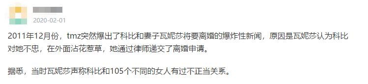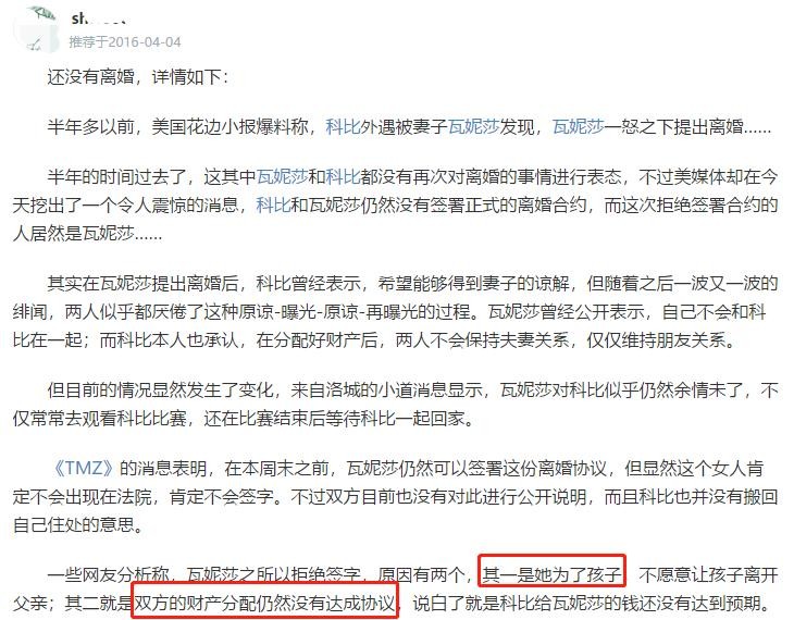 据一位网友在2016年回忆,在离婚协议曝光的半年后,拒签合约的竟然是瓦妮莎本人,尽管一波波关于丈夫的绯闻使她身心俱疲,尽管她曾公开表示自己不会再与科比在一起,但她还是对科比余情未了。