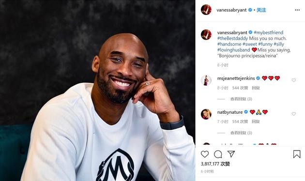 2月6日凌晨,科比遗孀瓦妮莎在某社交平台发文“我最好的朋友,最好的父亲,我好想你。帅气、甜蜜、有趣、傻傻的、爱着的丈夫,想念你对我说‘早上好,我的公主”,“太想你了”,瓦妮莎写道,并给科比贴上了“英俊”、“甜蜜”、“有趣”、“傻傻的”和“可爱的丈夫”等标签,还透露了科比给她取的昵称。