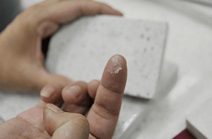 刮——用锋利的小刀或是钥匙在上面刮一下。因为真正的石英石硬度很高,如果说刮出了划痕且无法擦拭,同时掉落许多白色粉末,那么这样的石英石必然不好。真正的石英石被刮了之后只是有一道浅浅的黑色痕迹,稍微擦一下就没了。