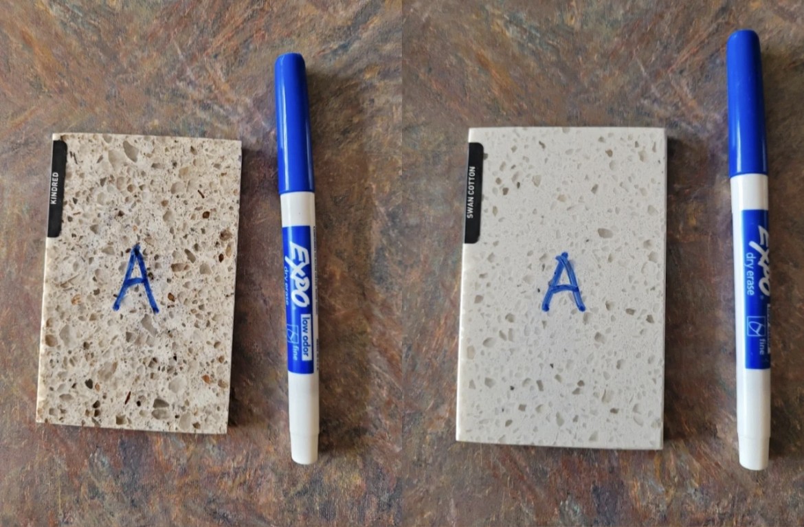 画——用马克笔在石英石台面画一下,等到10分钟后进行擦拭,如果能擦得掉,证明是好的石英石,如果渗色了擦不干净,那么证明石英密度不够,质量不好。