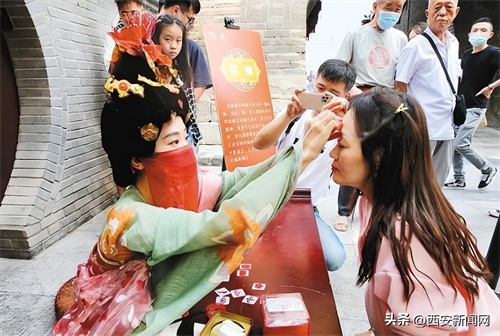 9月10日,在西安城墙景区,身着唐服的造型师为市民游客点花钿。