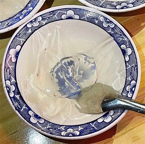 入口冰,含口凉,咽口爽,唇舌享受着它弱弱的触感要说这石凉粉,无色无味儿,有什么好吃的,但它的味道独特也就独特在无色无味上。