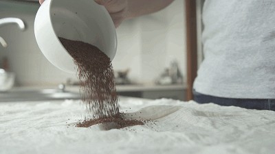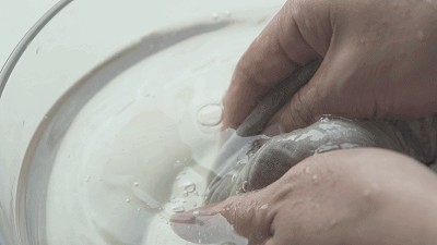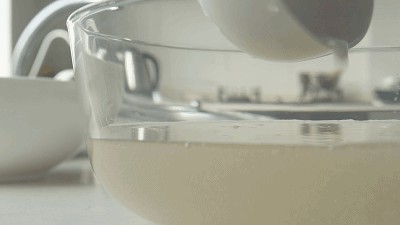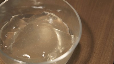 (2)将其放入凉白开盆中,轻轻地揉,一缕缕白雾从纱布里散出,渐渐化成柳絮状布满盆,与清水纠缠在一起,沉淀下去,放置一会儿