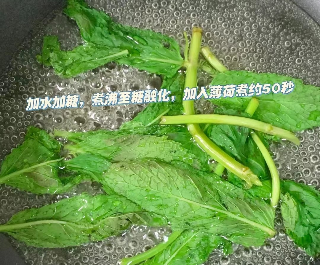 做法,加水加糖,煮沸至糖融化,加入薄荷鲜叶约50秒,凉后捞出薄荷叶,就完成了