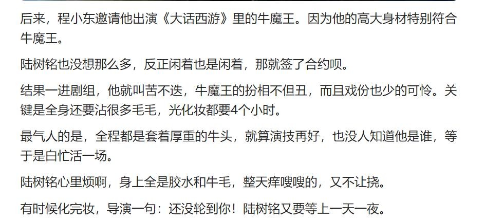 多年后陆树铭直言不希望署名,让导演刘镇伟别写他的名字。看来星爷拍戏确实磨人,当年巩俐拍《唐伯虎点秋香》也直言很难熬,只能说两位演员没有合作的很愉快令人遗憾,但是电影出来却影响了一代人,可见大家都很敬业,没有因为任何个人情绪就影响自己的表演。