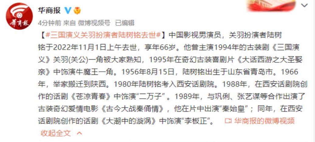 据悉,《三国演义》中三弟张飞的扮演者脑中风,晚年无人照料,陆树铭把三弟接进了自己办的养老院。为了多赚钱,陆树铭也是各种走穴、刷脸、演网大、代言游戏,曾一度被吐槽“晚节不保”,结果如今陆树铭先走了,令人唏嘘不已。