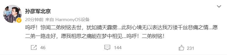 在他去世后,《三国演义》刘备的扮演者孙彦军发文悼念,他亲切地称呼其为“二弟”,直言得知消息犹如晴天霹雳,最后祝二弟走好。