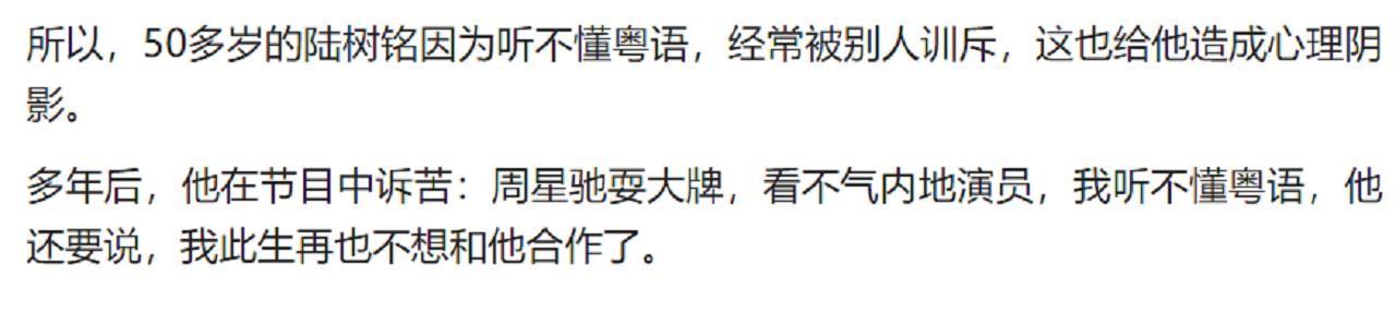 据悉,当时两人合作非常不愉快,陆树铭扮演的牛魔王不仅造型耗时又令人难受,而且一整天可能都拍不了一场戏,跟他对戏的周星驰因为只说粤语,陆树铭也完全听不懂,只好心里默默计数,一句一句磕磕巴巴地说台词,整部戏拍下来令他非常痛苦。事后直言不会再跟周星驰合作,甚至坦言周星驰可能看不起小演员。