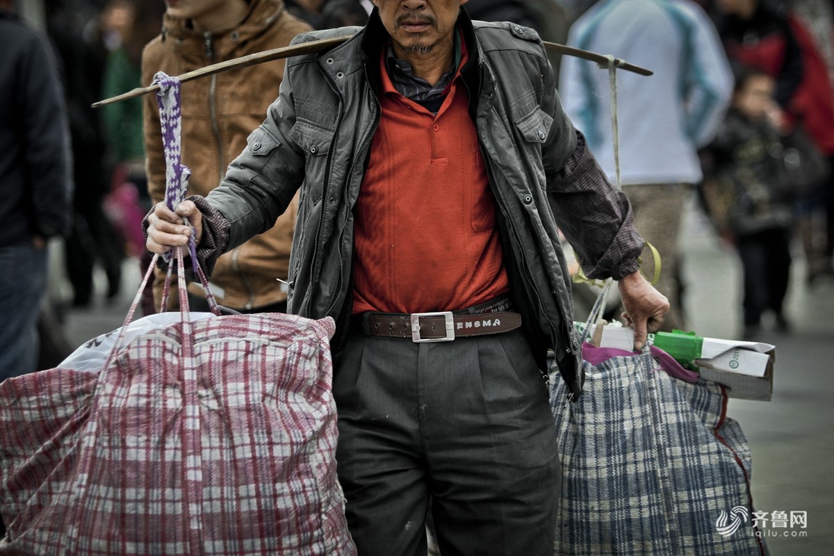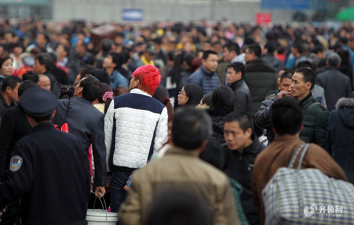 2015年2月4日,广东广州,2015年春运首日,摄影师探访广州火车站。广州火车站广场,一个染红发的年青人走在进站的人群中。