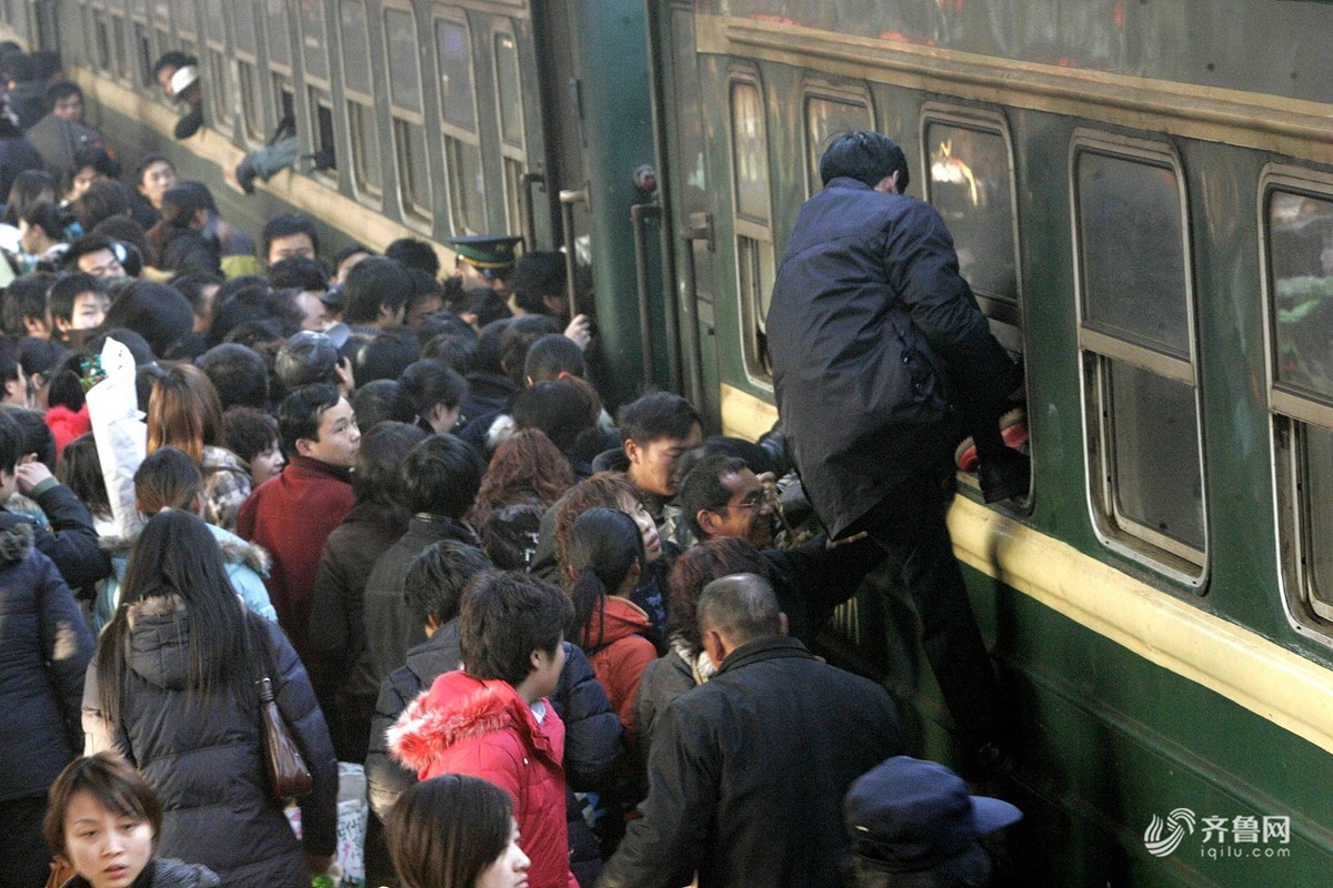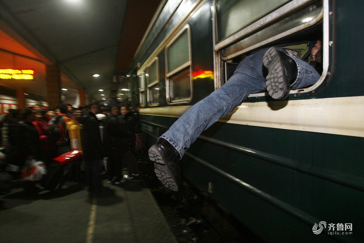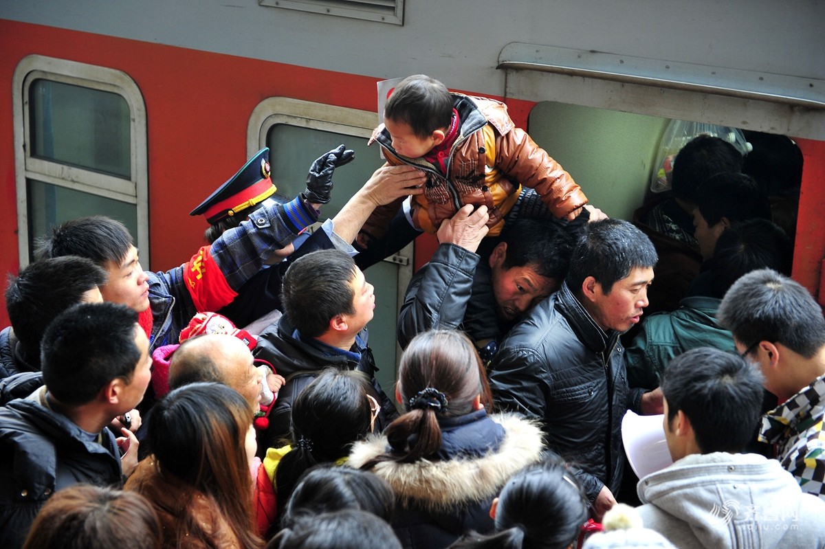 2008年1月23日 ,全国春运正式开始 ,湖北武汉各大车站的人流高峰也纷纷到来 。 武汉汉口火车站,因为拥挤害怕上不了车的旅客翻车窗上车。