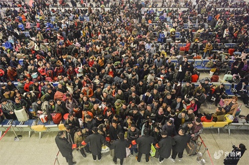 2017年1月13日,上海,春运首日,大批旅客在虹桥火车站候车。