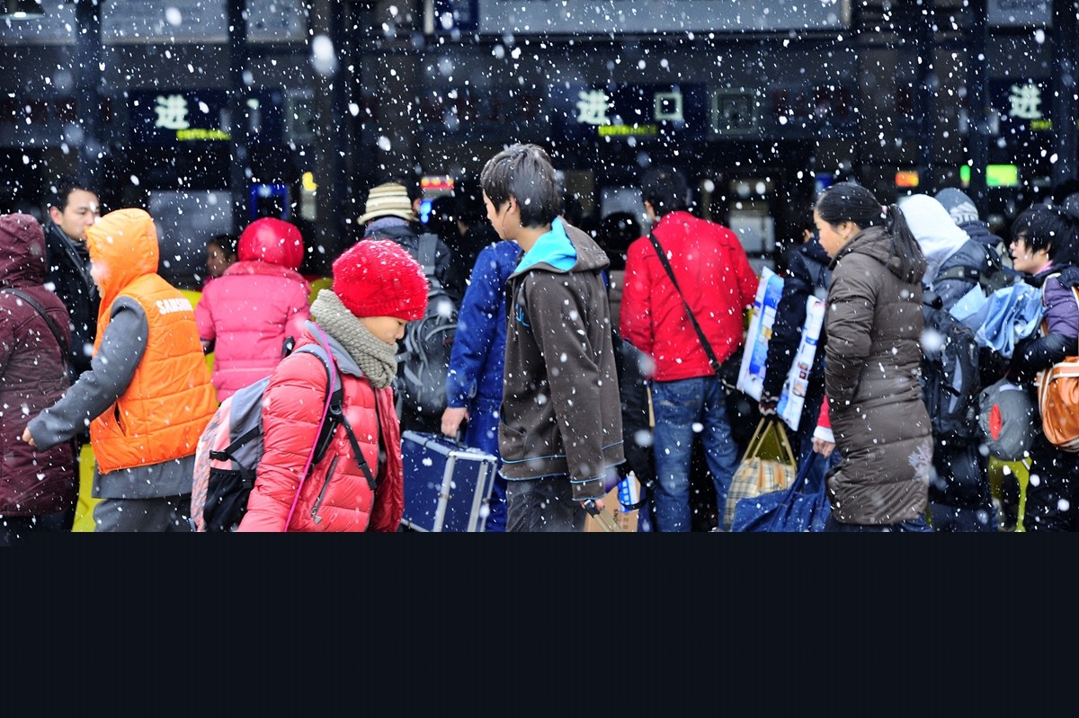 2011年1月19日,湖南省长沙火车站广场,旅客冒着风雪准备进站。当天,为期40天的2011年春运大幕正式拉开。受强冷空气南下影响,长沙遭遇罕见暴雪天气,市区大雪围城。该市启动雨雪冰冻灾害应急预案Ⅲ级响应,积极应对。