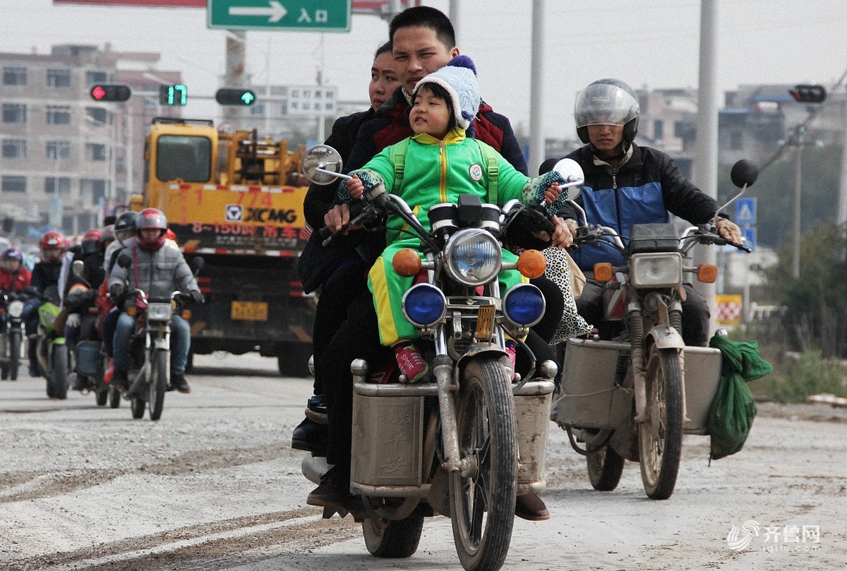 2016年1月30日,在粤桂交界的广西梧州市藤县路段,一名摩托车手搭着孩子长途跋涉赶回家乡过年。