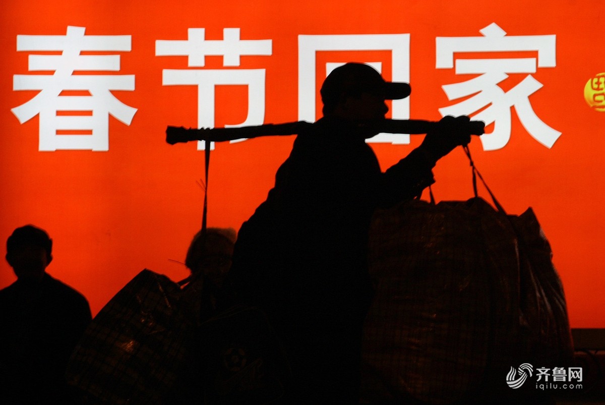 2015年2月3日,北京,春运期间北京火车站一个旅客扛着行李走过售票窗口。