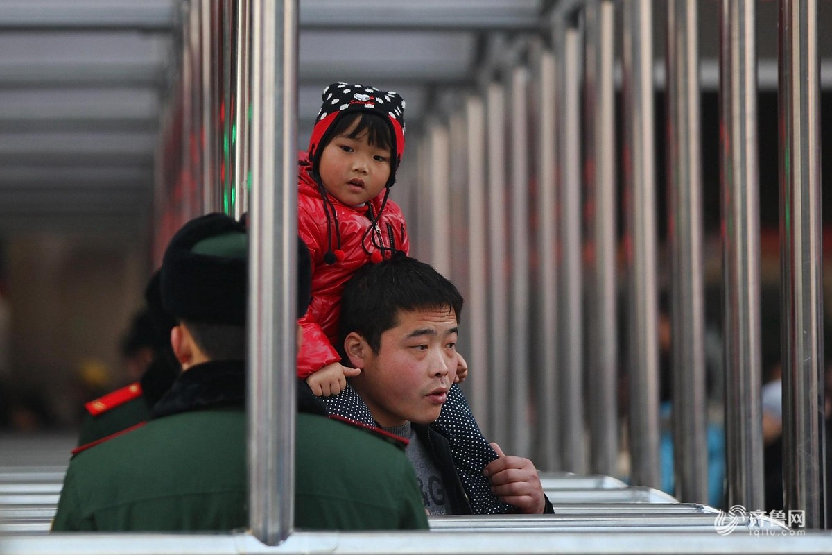2012年1月8日,北京,一对父女经过北京西站实名验票处。当日,为期40天的春运正式启动。