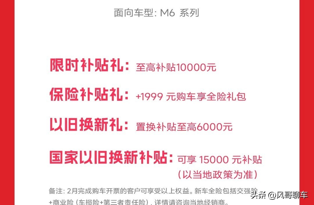 购买传祺M6的客户可享受1万元的限时补贴礼!另外除了1.5万元的国家置换补贴,广汽传祺还再叠加至高6000元的置换补贴!