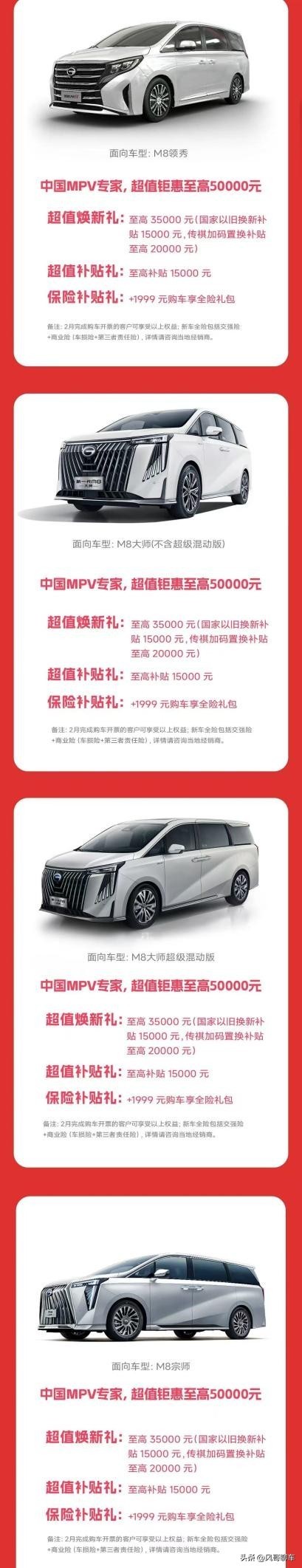 购买传祺M8的客户除了1.5万元的国家置换补贴外,广汽传祺再叠加至高2万元的置换补贴,加起来至高可获得3.5万元补贴。再加上至高1.5万元的超值补贴礼,叠加后综合钜惠至高可达5万元!