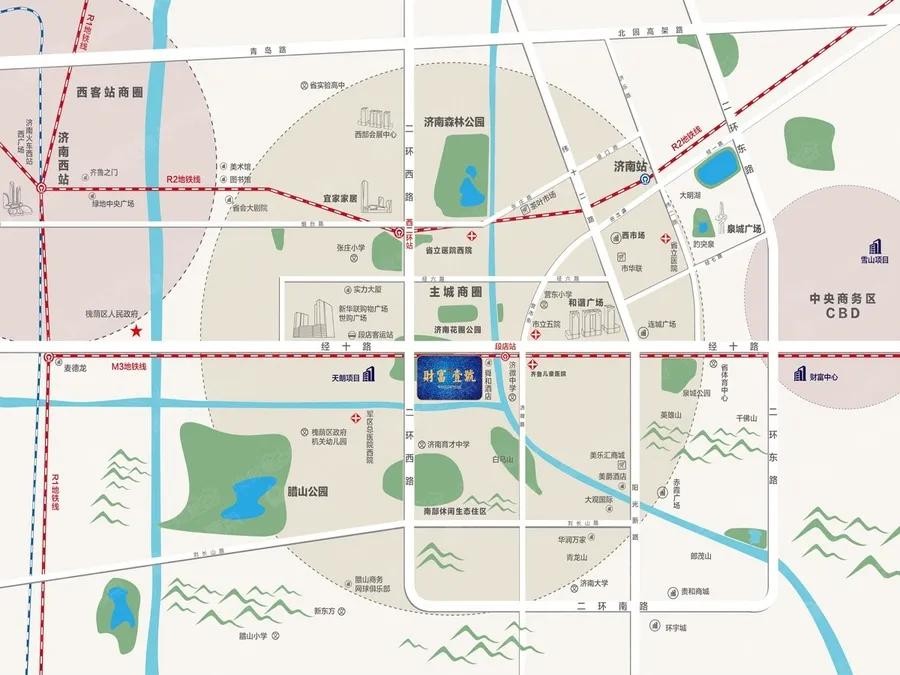 财富壹号地处槐荫区段店片区,位于经十路与二环西路交汇处东南角,目前项目在售三期,三期总占地面积 160000平,建筑面积 900000平。
