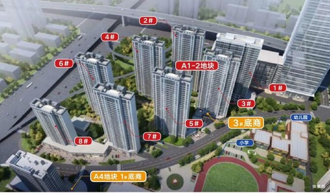 项目包1宗商业用地和2宗住宅用地。A-1-2地块规划8栋楼,容积率3.6。其中,1#楼为居住公寓;2#楼、3#楼、4#楼、5#楼、6#楼、7#楼这7栋楼为高层住宅;8#楼为小高层住宅。