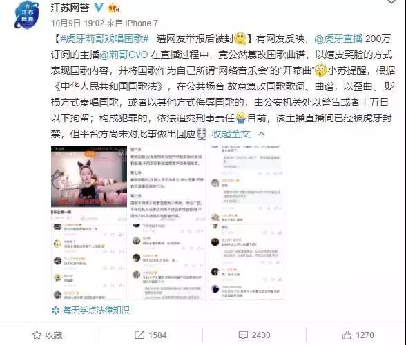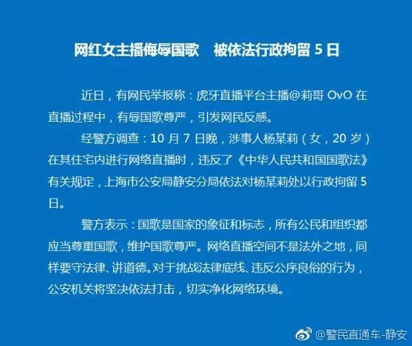 国歌岂容亵渎!虎牙直播主播“莉哥OvO”被行拘5日 网红素质何时能跟上颜值