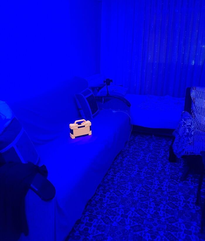 25、在蓝色灯光的映照下,我的橙色工具箱仿佛变成了一个真实的游戏物品。