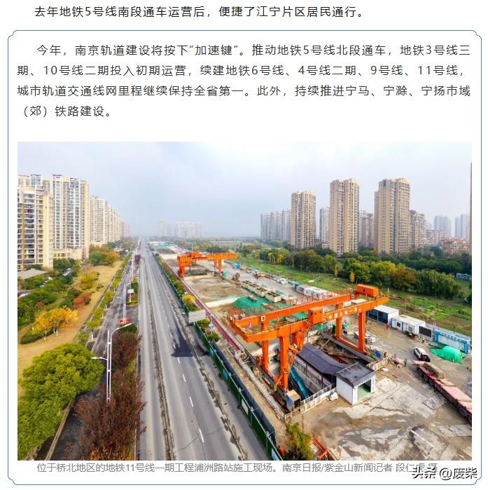 不过,会议没有明确提及6号线北段和宁马城际,这两条地铁今年通车呼声也很高。会议的说法是:将续建地铁6号线、4号线二期、9号线、11号线,城市轨道交通线网里程继续排名全省第一。此外,还将持续推进宁马、宁滁、宁扬3条市域铁路建设。