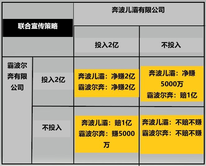 举个例子:有两家公司,“奔波儿灞有限公司”和“霸波尔奔有限公司”,受退休金制度大力开放的结果,两家公司都在大力发展各自的退休金业务。但是新的这种退休金制度大家很难接受。于是两位创始人见面商量了一下,大家共同投入,培育市场。你们立下了一个君子协定,各投入2亿元,大举宣传新的退休金制度。