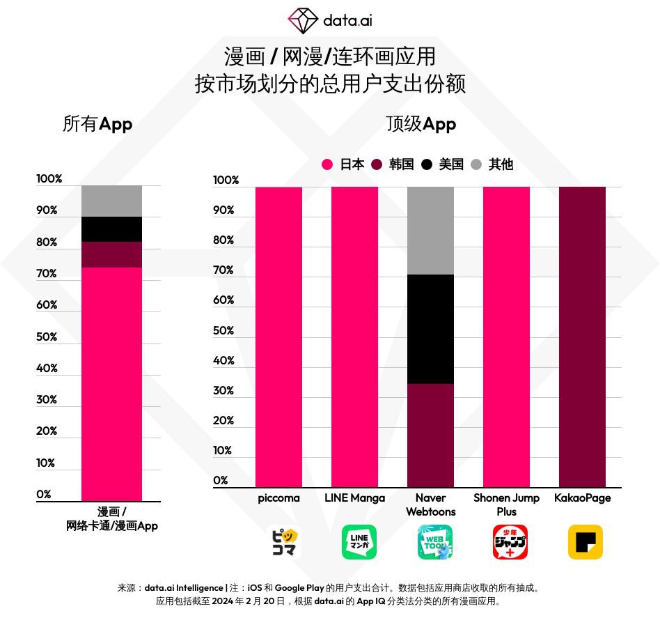 尽管韩国的竞争日益激烈,但这一领域仍然高度集中在日韩中美四个市场。不过,韩国市场的崛起表明,只要能提供合适的内容,漫画应用也能在非热门市场取得突破。且 LINE Manga 等应用所取得的成绩表明,这些应用的营收潜力高达数十亿美元。