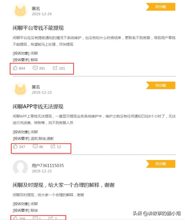 不过,黑猫消费者服务平台显示,被多名用户投诉的“闲聊”app并未入驻,服务平台对于这类投诉的回复为:我们将尽快帮您寻找商家,推进其处理投诉,请保持手机畅通并留意官方消息推送。