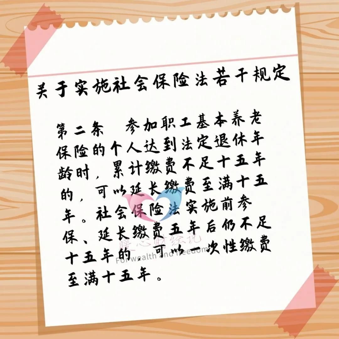 ①如果是我们的养老保险个人账户是在实施社会保险法制度以前建立的(说明个人已经参保),可以在延长缴费5年后,还不够15年的,一次性补齐15年。