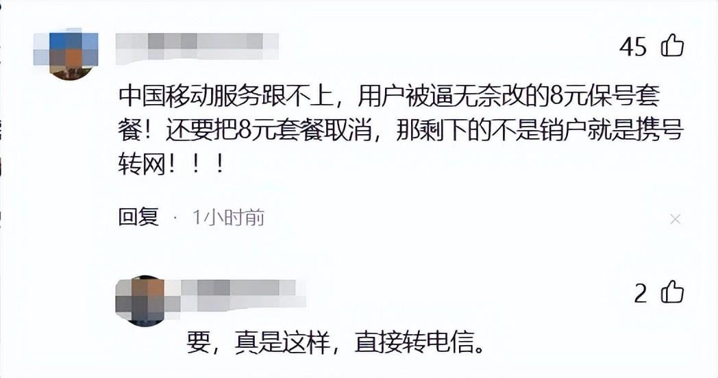 中国移动服务跟不上,用户被逼无奈改的8元保号套餐!还要把8元套餐取消,那剩下的不是销户就是携号转网!!!