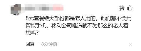 8元套餐绝大部份都是老人用的,他们都不会用智能手机,移动公司难道就不为那么的老人着想吗?