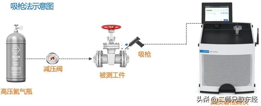 类似卤素气体正压检漏,腔室或管路内充入氦气,检漏仪连接吸枪放在可能泄漏的地方,检测是否有氦气泄漏。