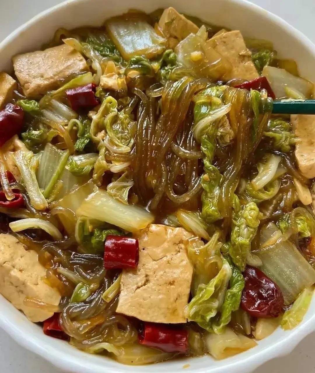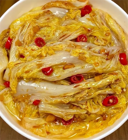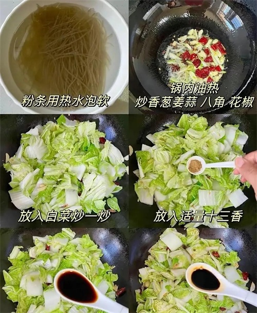 这是一道清爽可口的凉菜。将白菜切丝,粉丝煮熟备用。将切好的白菜丝和煮熟的粉丝放入大碗中,加入适量盐、醋、生抽和香油,拌匀即可。