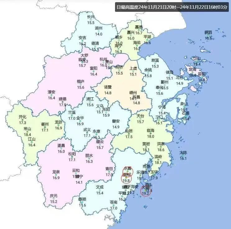 今天早晨浙北的最低气温大部在10℃以下,浙中南稍高,也仅为10-12℃之间,白天多云为主,尽管阳光微弱,但有了它的出场,寒意驱散,让白天的舒适度增加了不少。截至下午4点03分,省内大部地区的最高气温在15-18℃之间,前三甲均出现在东南沿海的温州,最高气温接近20℃,是秋高气爽的感觉没错啦。