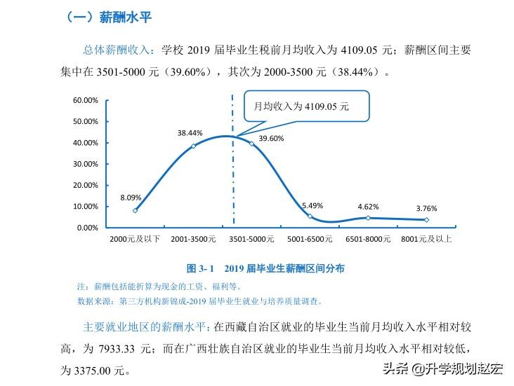 再来看看收入情况,2020届未公布薪酬水平,我们来看看2019届的收入水平,平均4109元,低于3500元的占比46%;整个收入水平呈正态分布;西藏的收入是最高的,但是消费也不低哈;我认识的几个西藏的警察,月收入都是12000+;