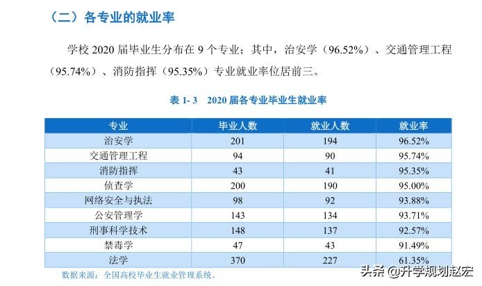 各个专业的就业率情况,总共九个专业,其中,治安学(96.52%)、交通管理工程(95.74%)、消防指挥(95.35%)专业就业率位居前三。就业率最低的是法学专业,只有61.35%,有一半的同学未就业,从侧面也可以看得出,本科法学找工作的难度有多大;同时也是每年红牌专业的常客;法学就业差,和专业本身的要求有很大的关系,法学名校毕业的就业率都不高,何况一般学校的法学;