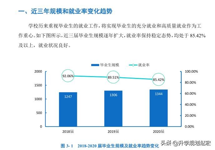 从近三年就业质量报告数据对比,从2018届的92.06%下降到了85.42%;另外有19人选择了升学,占比1.41%;从具体毕业去向来看,“其他录用形式就业”为毕业生主要去向选择,占比为 68.38%;“签就业协议形式就业”次之,占比为 15.10%。